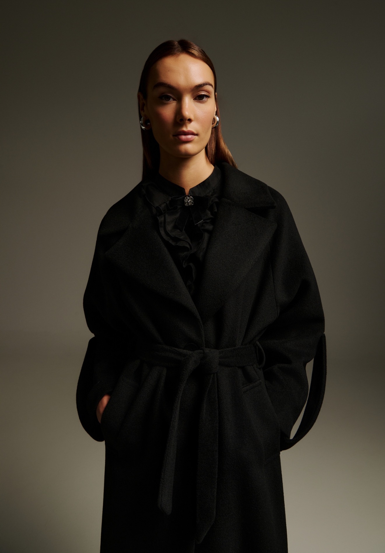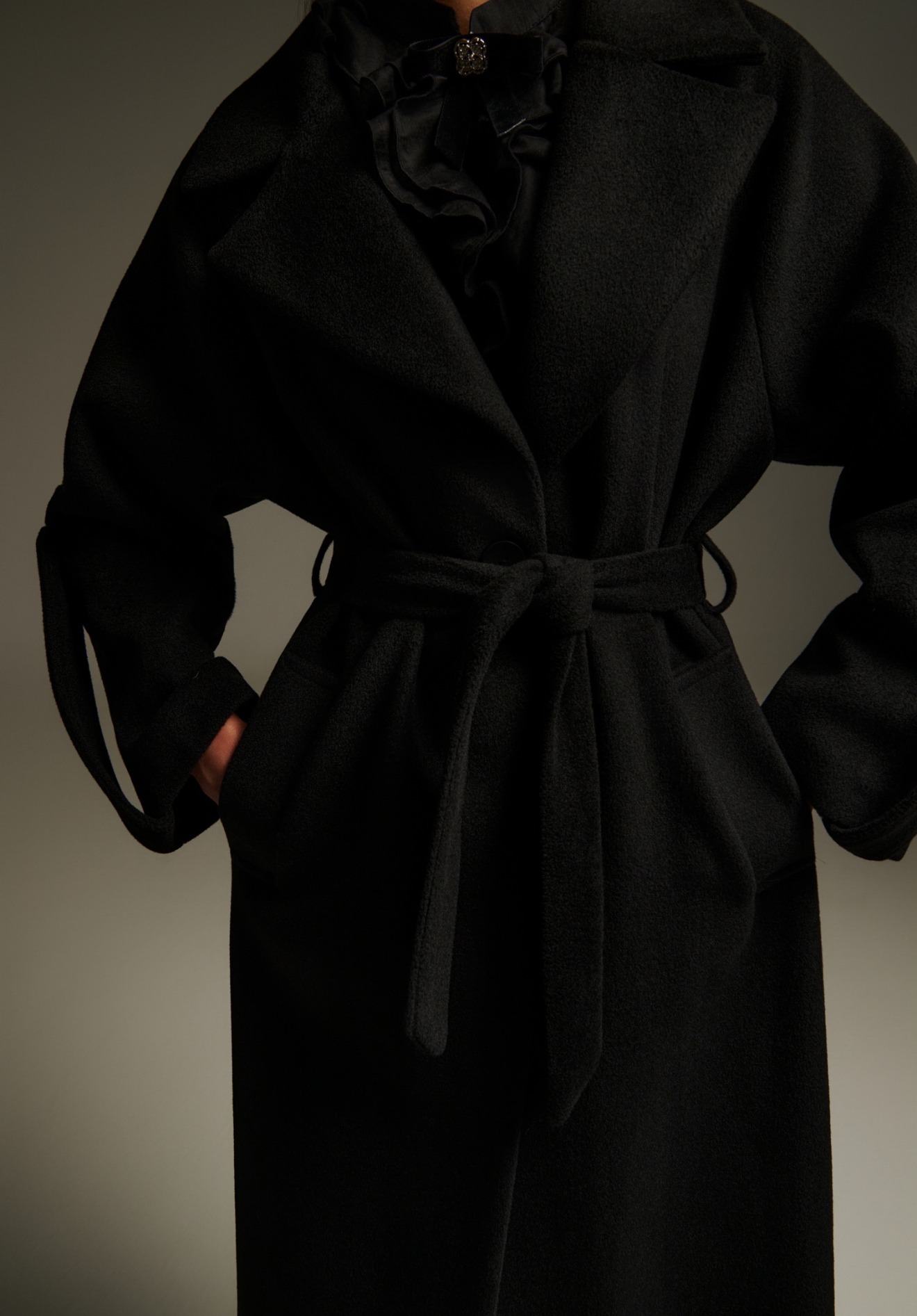 Μάλλινο maxi παλτό με ζώνη, μονό κουμπί μπροστά και ανδρικό πέτο. Το ύφασμα είναι χοντρό, σε ψιλή υφή, με οικολογική επένδυση για ζεστασιά. Η ζώνη τονίζει τη μέση, ενώ η ίσια γραμμή προσδίδει διαχρονικά modern χαρακτήρα. Συνδυάζεται με matching tailored παντελόνι για sleek, minimal outfit.