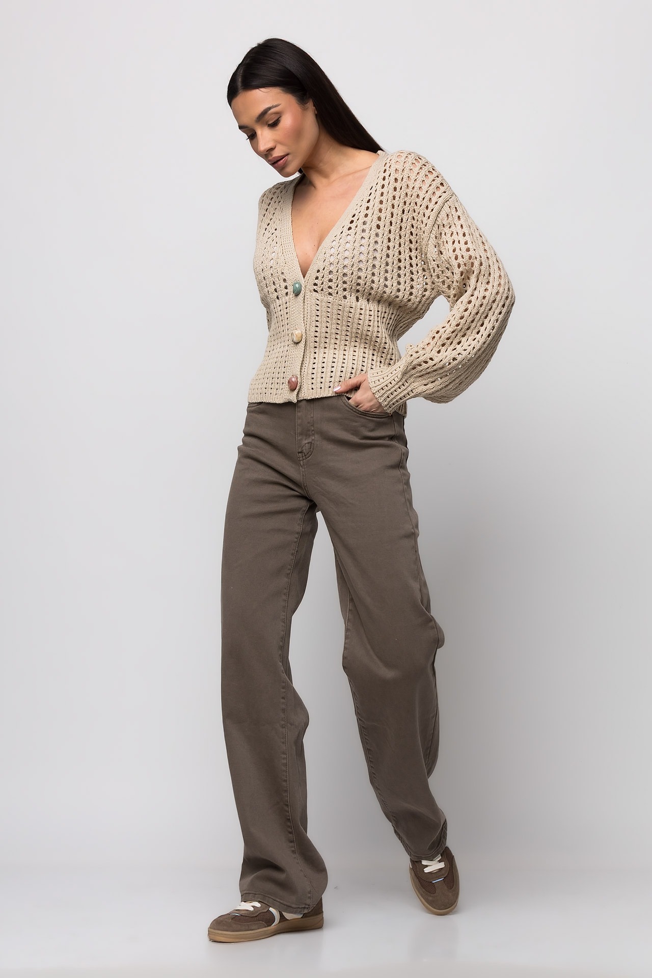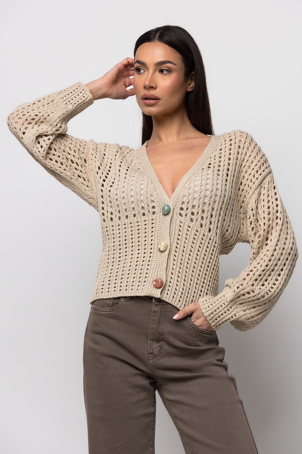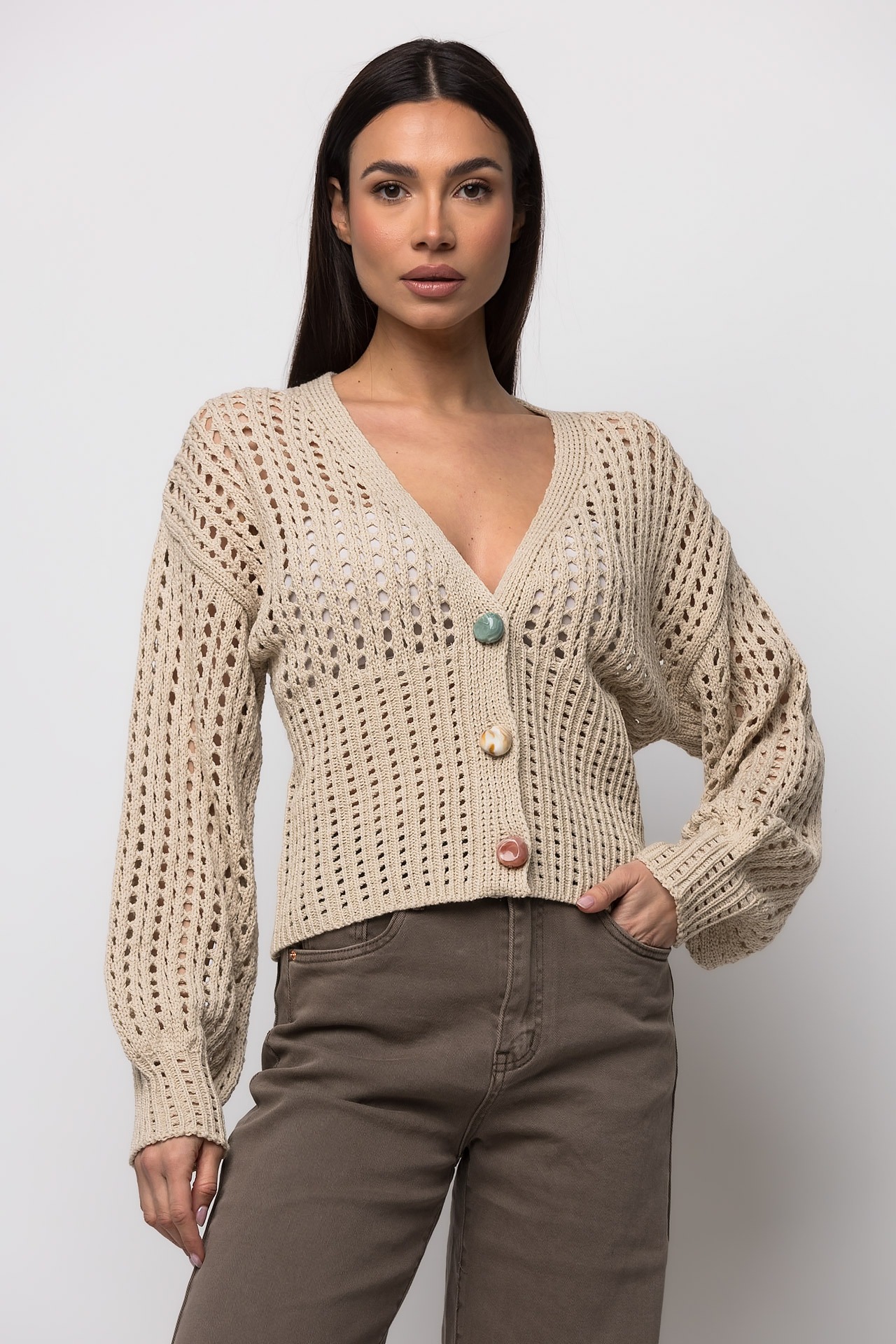 Ζακέτα πλεκτή διάτρητηΚλείσιμο με κοκάλινα χρωματιστά κουμπιάΕλαστικό ύφασμαΚανονική εφαρμογή