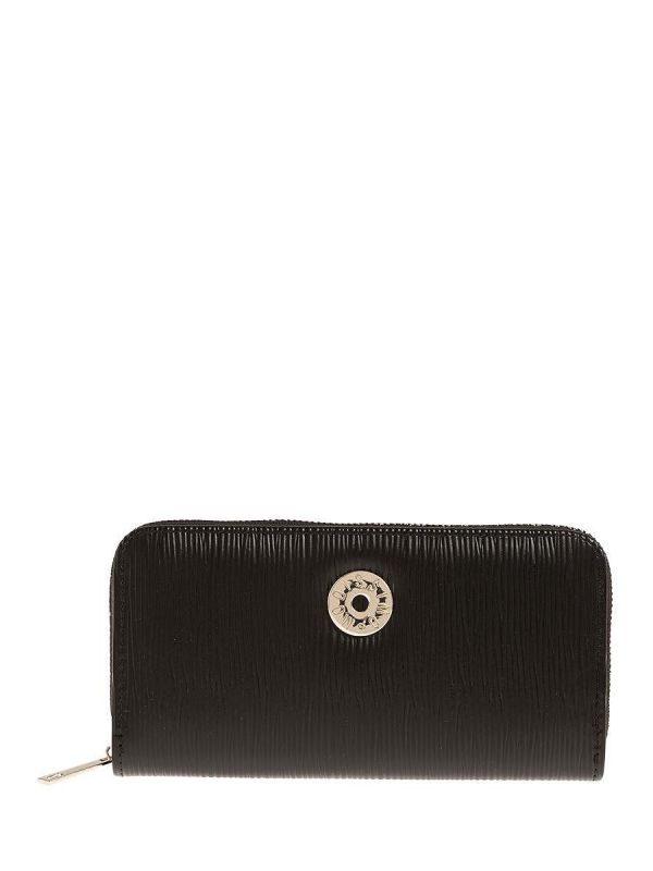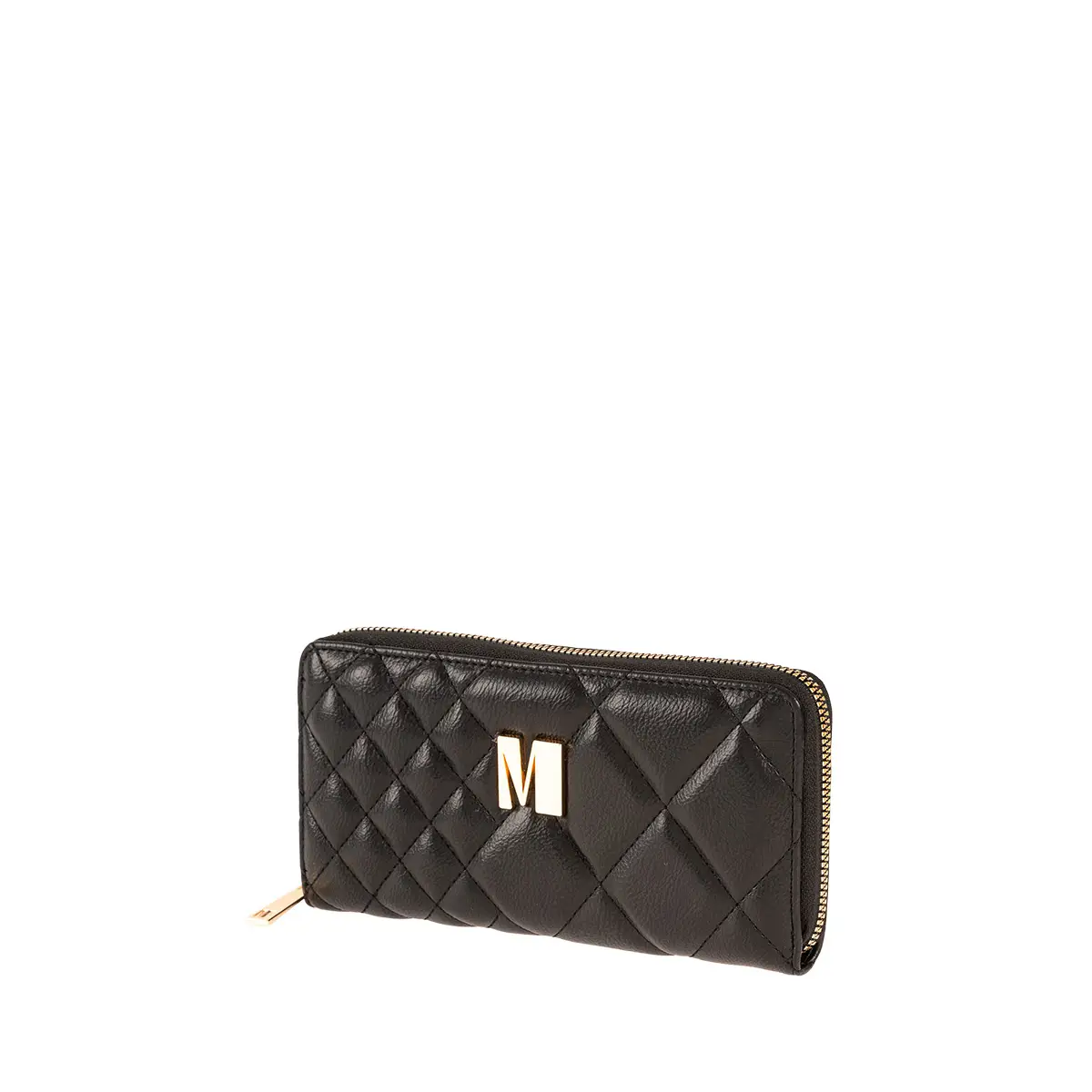 Γυναικείο πορτοφόλι από καπιτονέ ανθεκτικό συνθετικό δέρμα. Κλείνει με φερμουάρ και το εσωτερικό του χωρίζεται σε δύο θήκες για χαρτονομίσματα, έχει μια τσέπη με φερμουάρ για κέρματα, δύο πλαϊνές τσέπες και οκτώ θήκες για κάρτες.