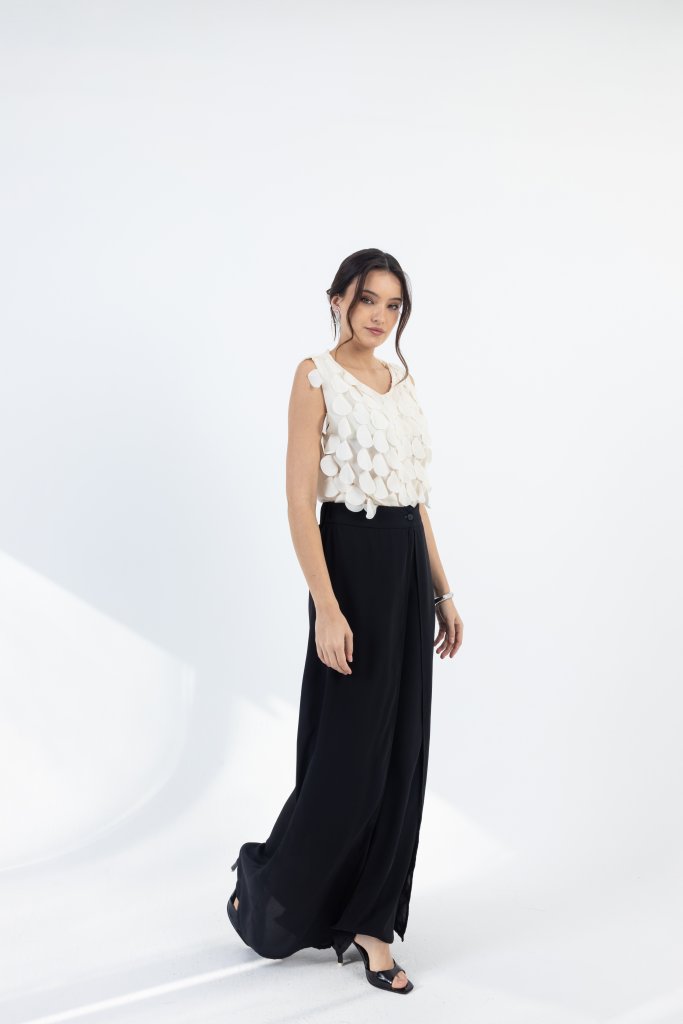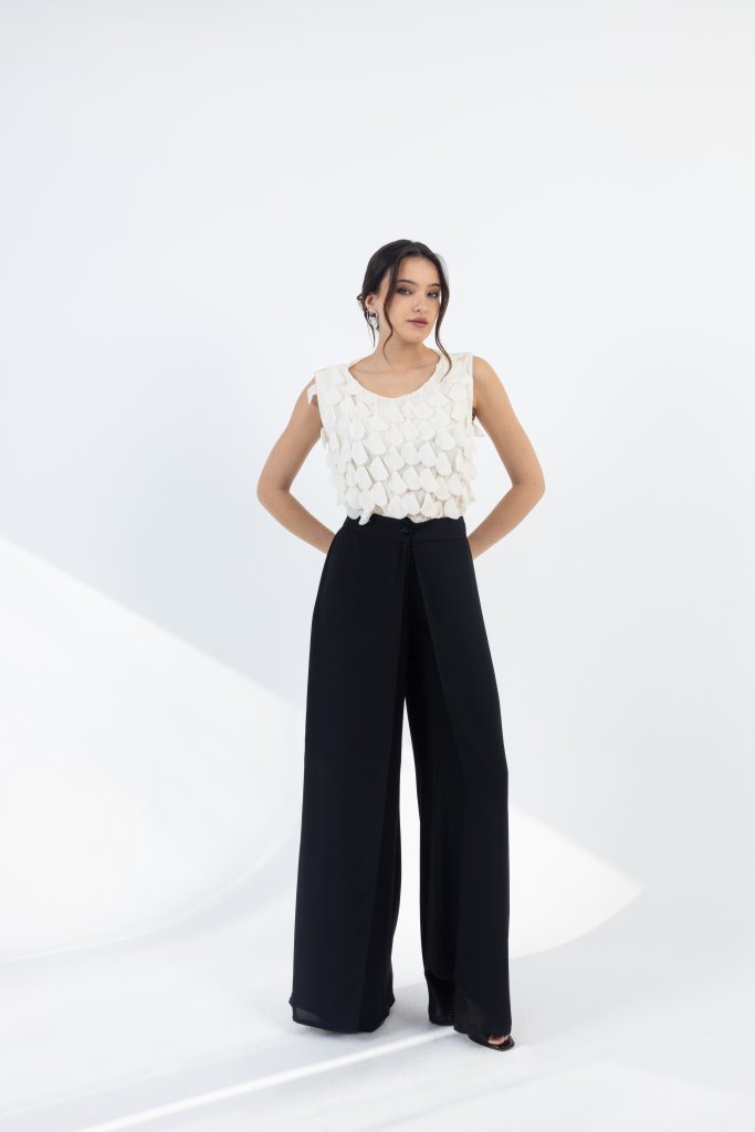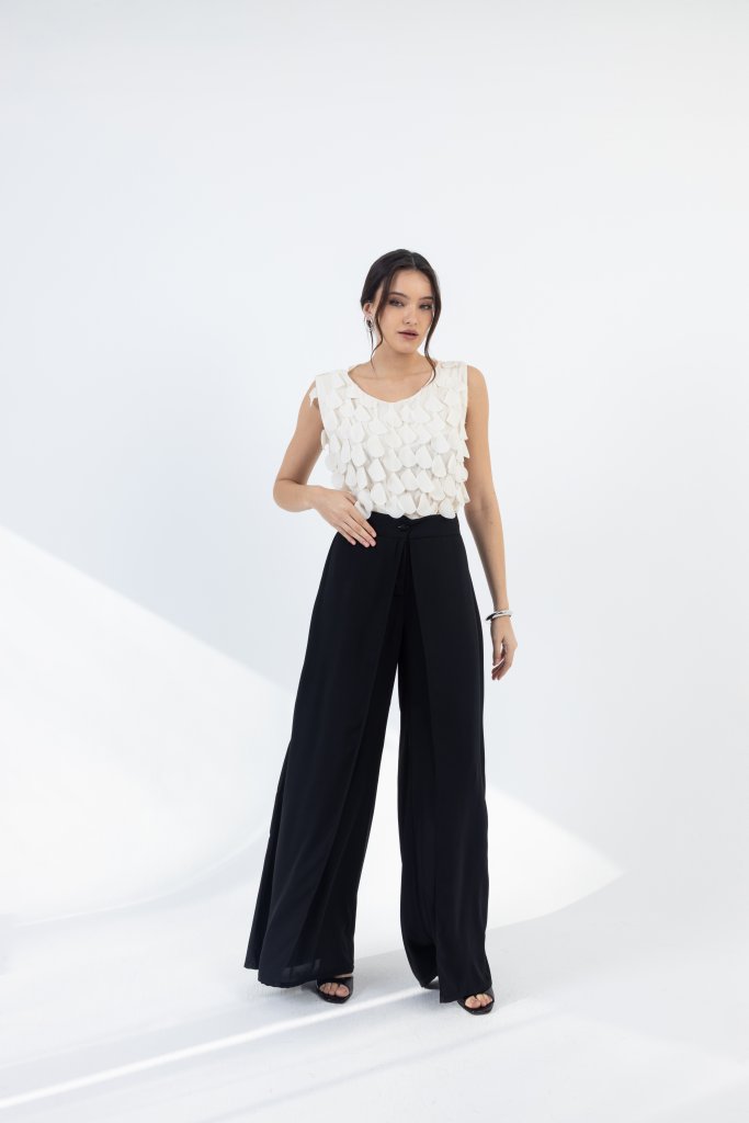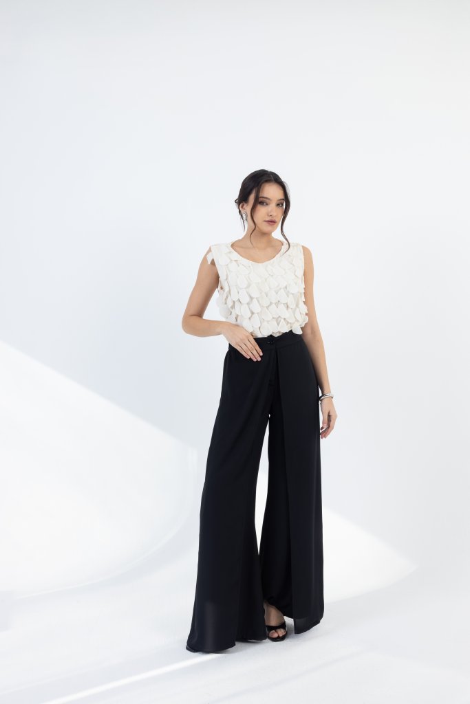 Μοντέρνα λευκή αμάνικη μπλούζα με ιδιαίτερη υφή που ξεχωρίζει. Το ύφασμά της διαθέτει ανάγλυφες, διακοσμητικές λεπτομέρειες που δημιουργούν διάσταση και κομψό αποτέλεσμα, δίνοντας στο total black look χαρακτήρα και μοντέρνα αισθητική.