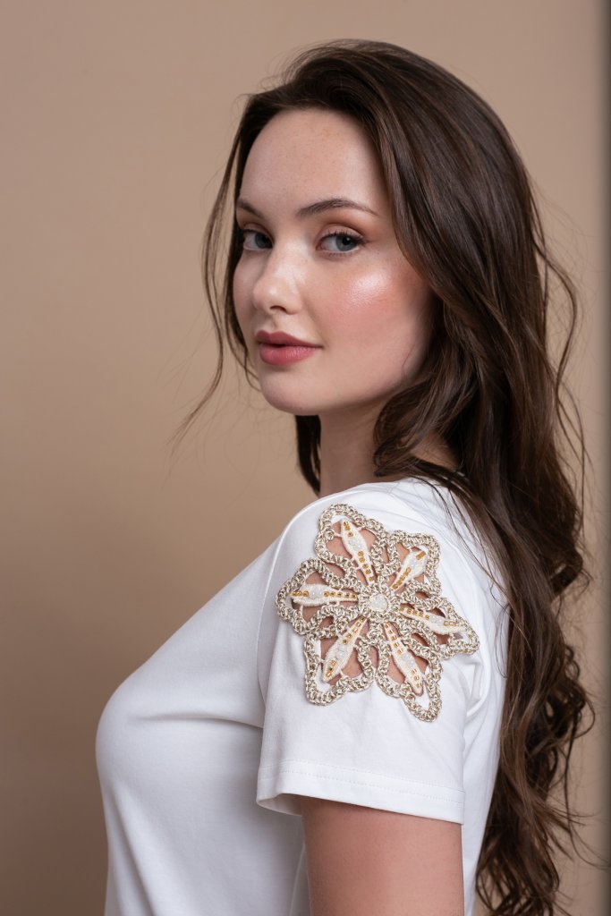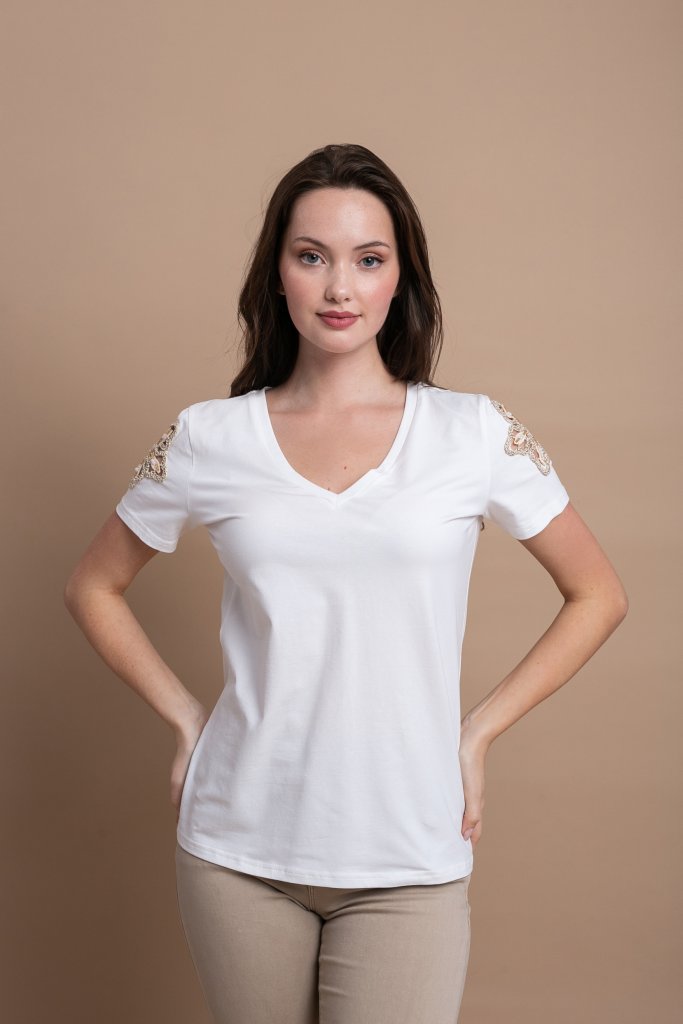 Open Μπλούζα με V Λαιμόκοψη και Σχέδιο στον΄Ωμο| Λευκό