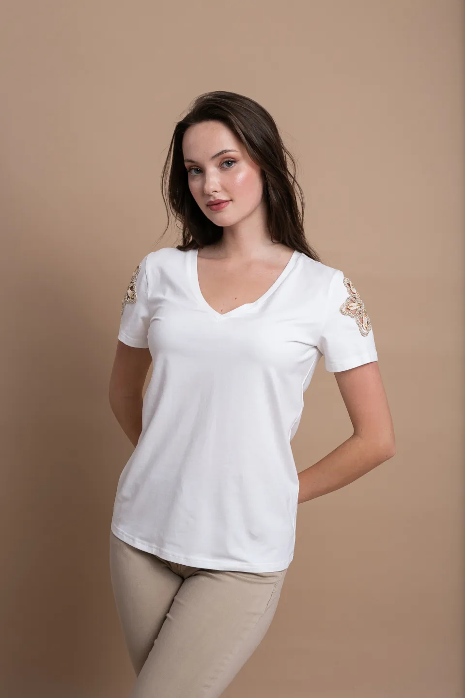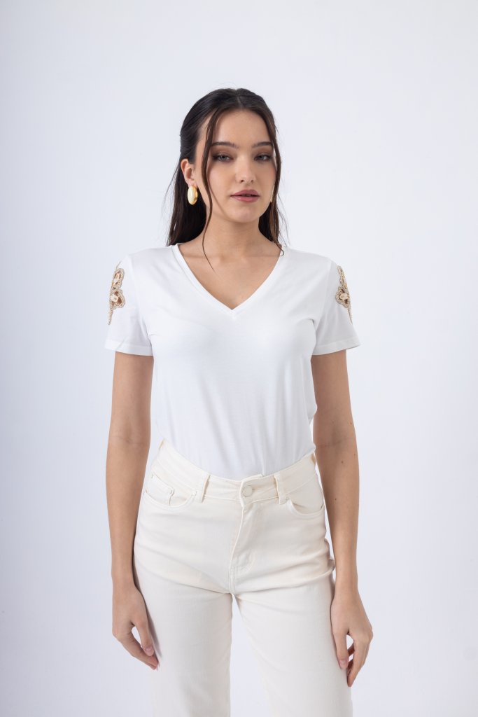 Κομψή και διαχρονική λευκή μπλούζα που αποτελεί βασικό κομμάτι για κάθε σύγχρονη γκαρνταρόμπα. Η απαλή υφή του υφάσματος αγκαλιάζει το σώμα χαρίζοντας άνεση καθ’ όλη τη διάρκεια της ημέρας, ενώ η V λαιμόκοψη αναδεικνύει διακριτικά το ντεκολτέ, προσθέτοντας μια θηλυκή και εκλεπτυσμένη νότα.