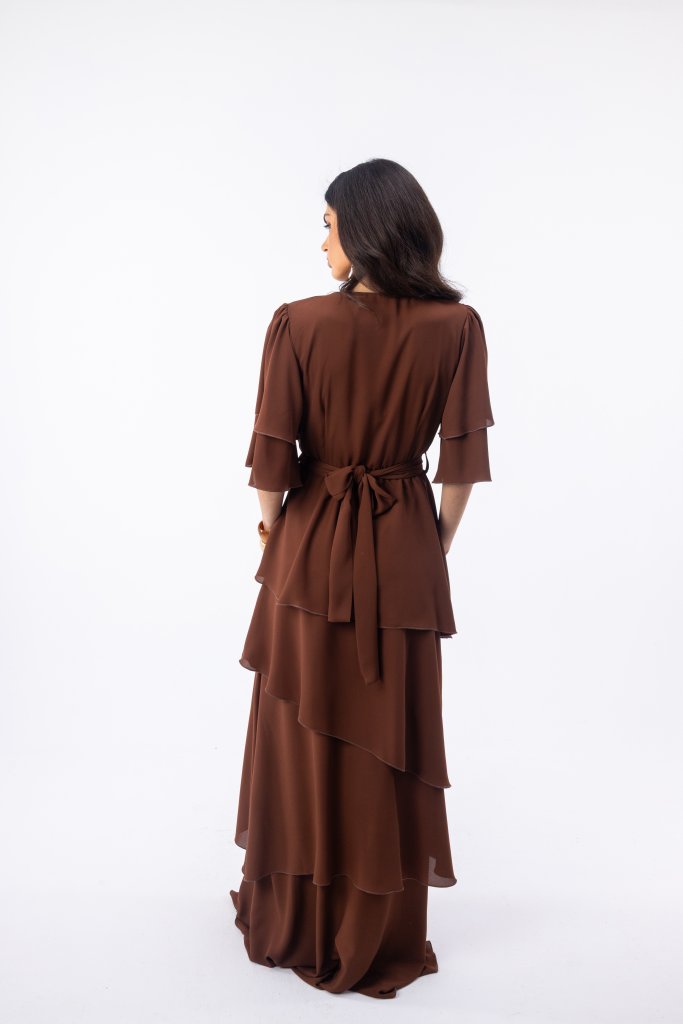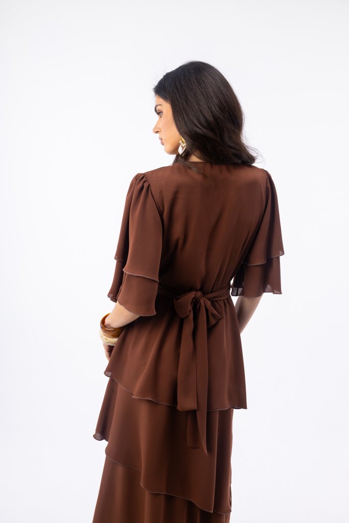 Open Maxi Φόρεμα Κρουαζέ με Βολάν Μανίκια και Ζώνη Μέσης | Καφέ