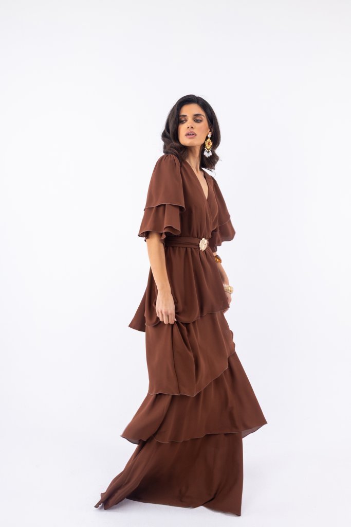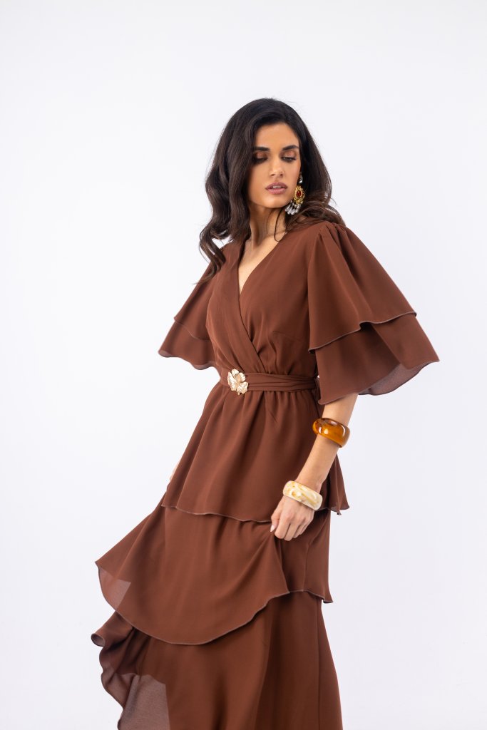 Η έντονη καφέ απόχρωση φωτίζει την εμφάνιση και χαρίζει μια σύγχρονη αισθητική, επιτρέποντας στο σχέδιο να ξεχωρίζει χωρίς υπερβολές. Η maxi γραμμή προσφέρει αέρινη κίνηση και elegant χαρακτήρα, ενώ τα βολάν μανίκια προσθέτουν ρομαντική διάθεση και ανάλαφρο όγκο. Το ύφασμα πέφτει φυσικά στο σώμα, χαρίζοντας άνεση και κομψότητα σε κάθε περίσταση.