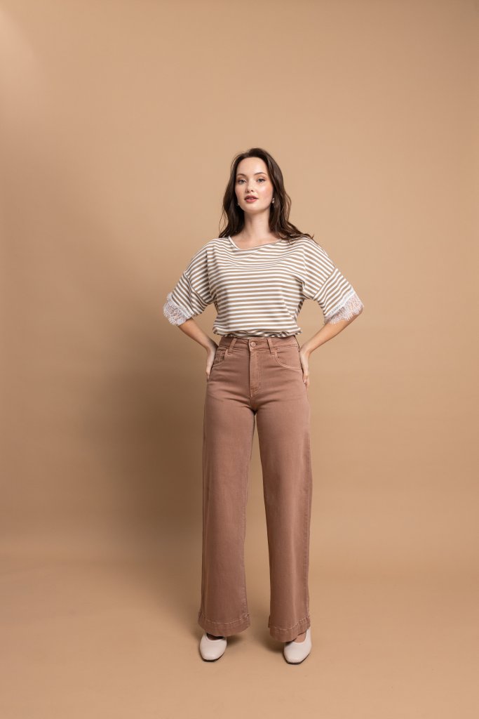 Κομψό παντελόνι με ψηλόμεση εφαρμογή και φαρδιά γραμμή που χαρίζει άνεση και κομψότητα σε κάθε εμφάνιση. Το διαχρονικό του σχέδιο αγκαλιάζει τη μέση και ανοίγει απαλά προς τα κάτω δημιουργώντας μια ισορροπημένη και κολακευτική σιλουέτα. Διαθέτει πρακτικές τσέπες και καθαρές γραμμές που το κάνουν ιδανικό για καθημερινά αλλά και πιο προσεγμένα σύνολα.
