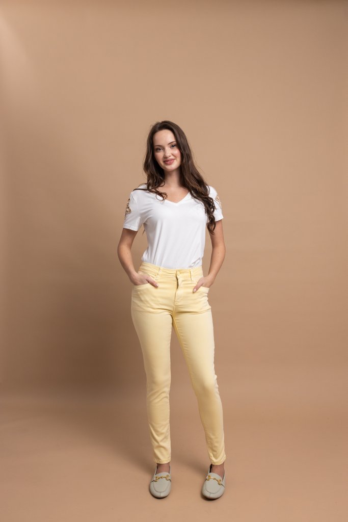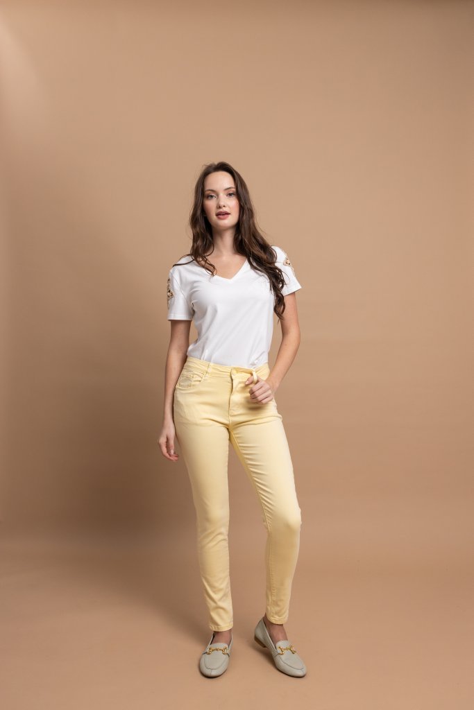 Μοντέρνο γυναικείο παντελόνι σε κίτρινη απόχρωση που προσφέρει κομψότητα και ευελιξία σε κάθε εμφάνιση. Η slim fit γραμμή του αγκαλιάζει τη σιλουέτα, τονίζοντας τη θηλυκότητα, ενώ η ψηλόμεση εφαρμογή εξασφαλίζει άνεση και σταθερότητα, δημιουργώντας ένα καλαίσθητο και ισορροπημένο αποτέλεσμα.