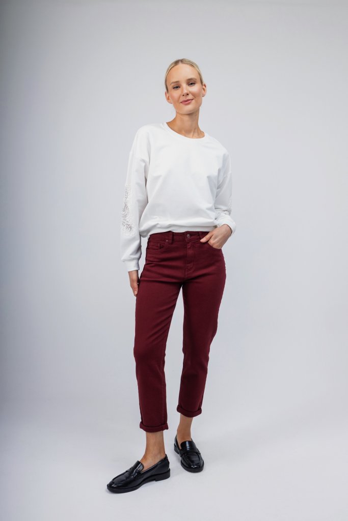 Γυναικείο παντελόνι σε mum fit γραμμή και μπορντώ χρώμα. Κλείσιμο με φερμουάρ και κουμπί. Ένα κλασικό σχέδιο που μπορείτε να το συνδυάσετε με το αγαπημένο σας πουλόβερ και να αναβαθμίσετε το χειμερινό σας outfit.