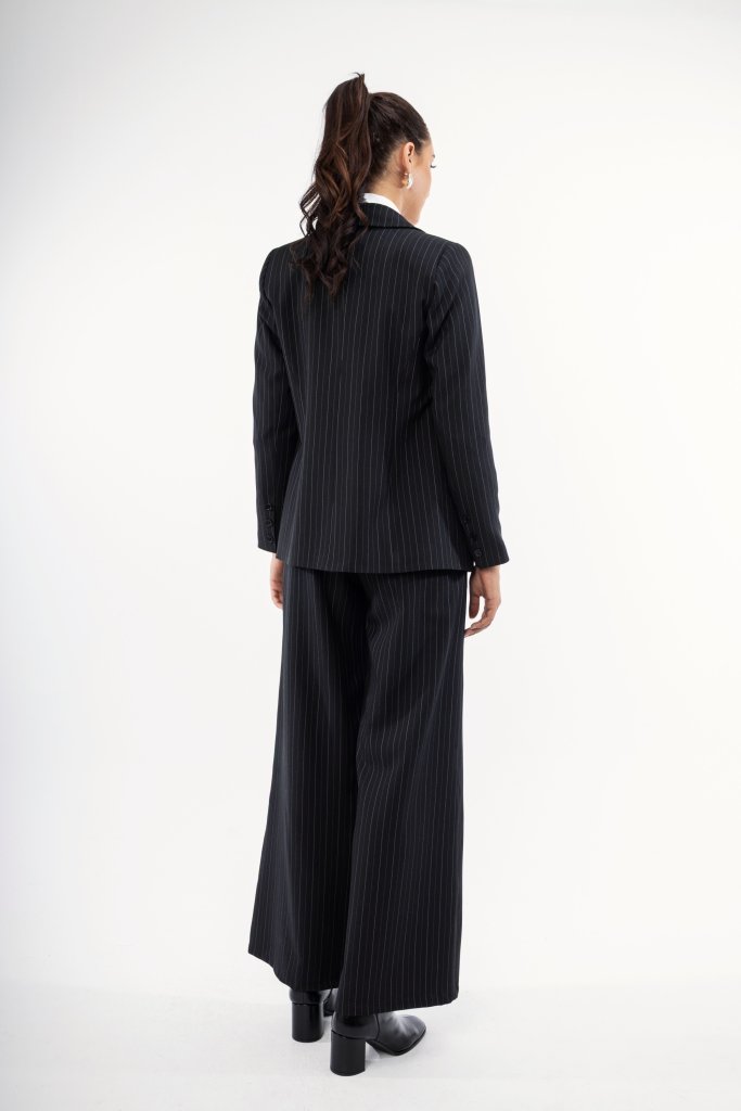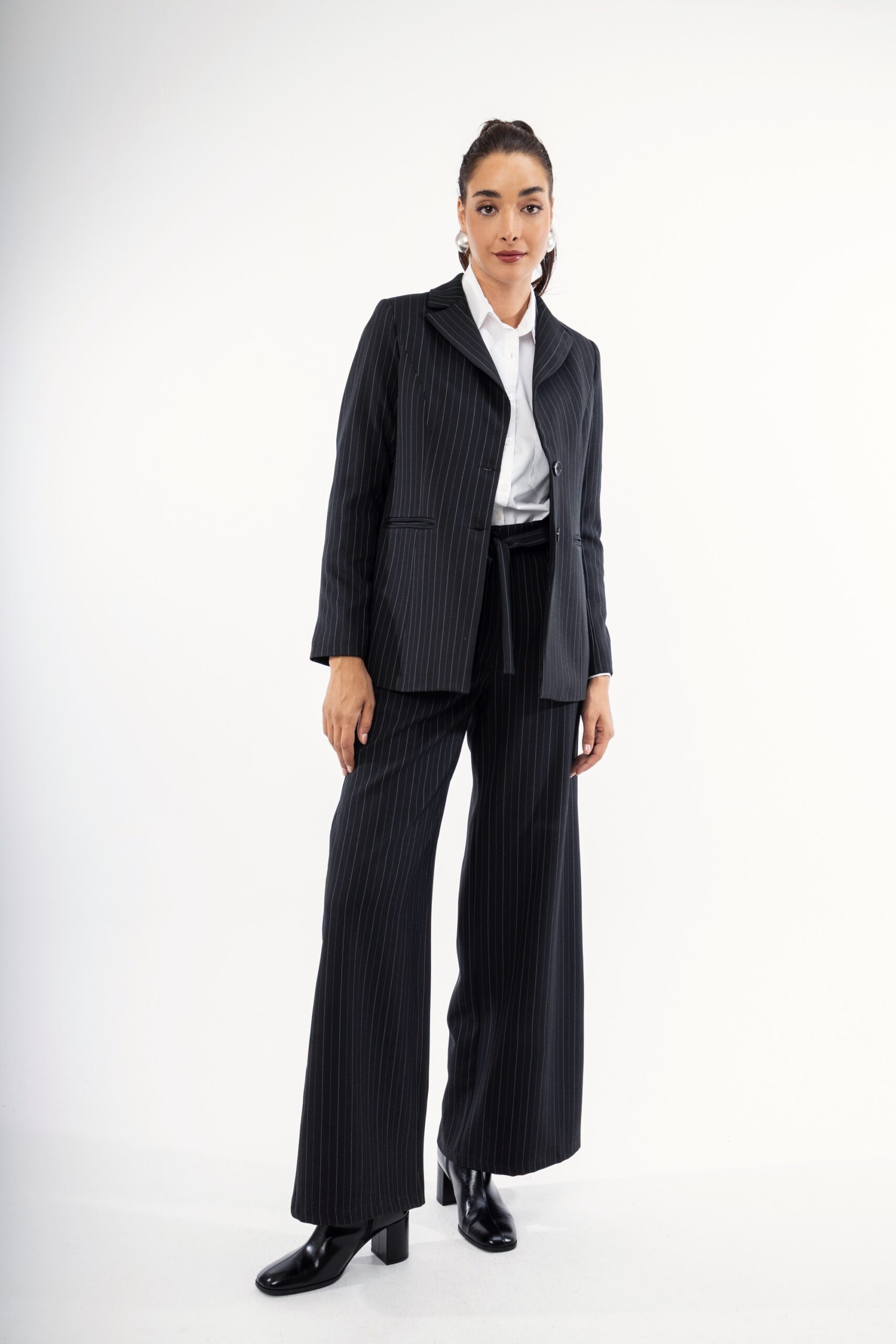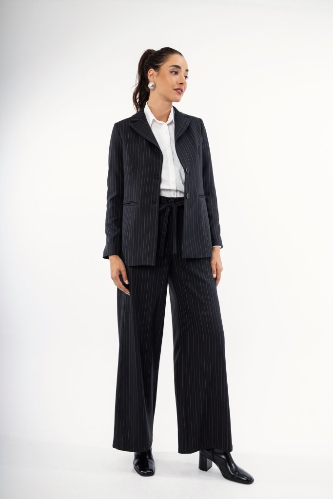 Γυναικείο παντελόνι σε μαύρο χρώμα με ριγέ σχέδιο. Κλείσιμο με κουμπί και ζώνη περιμετρικά για καλύτερη εφαρμογή. Μια διαχρονική επιλογή που βρίσκεται πάντα στο επίκεντρο της μόδας. Συνδυάστε το για ένα τέλειο σύνολο και με το αντίστοιχο σακάκι.