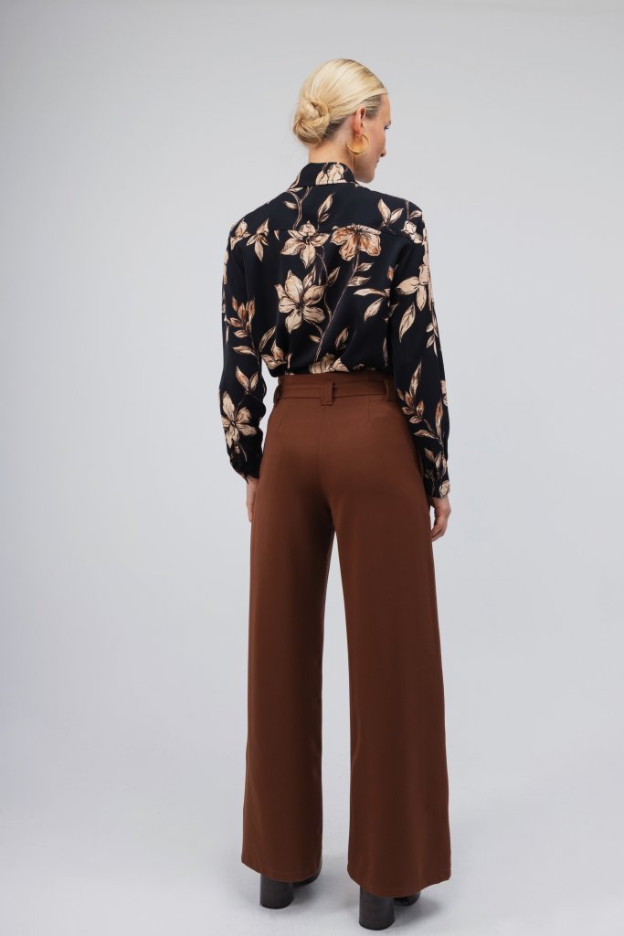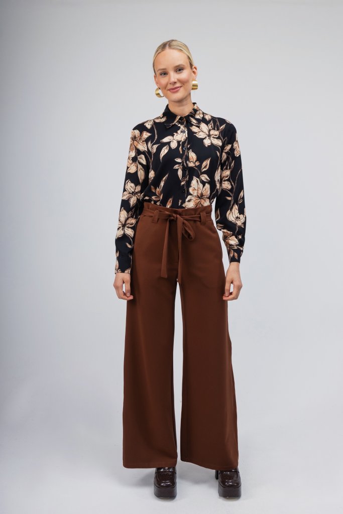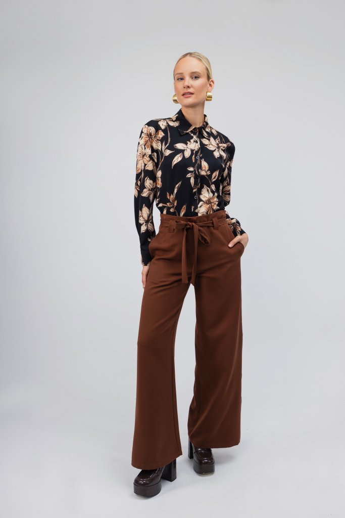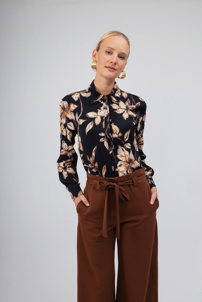 Άκρως εντυπωσιακό γυναικείο πουκάμισο σε σκούρο καφέ χρώμα με μπεζ λουλούδια. Κλείσιμο με κουμπιά. Συνδυάστε το με ένα μονόχρωμο παντελόνι και δημιουργήστε το απόλυτο office look.