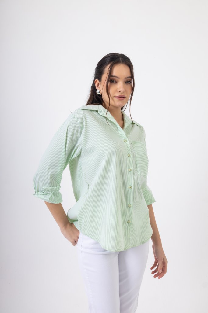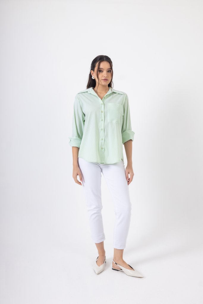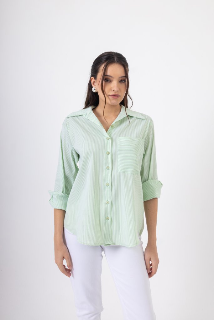 Κομψό πουκάμισο με λεπτές ρίγες σε ανοιχτό χρώμα μέντας που δημιουργούν ένα φωτεινό και ιδιαίτερο αποτέλεσμα. Διαθέτει κλασικό γιακά και κλείσιμο με κουμπιά στο μπροστινό μέρος, ενώ η διακριτική τσέπη στο στήθος προσθέτει μια μοντέρνα πινελιά στο σχέδιο. Η άνετη γραμμή του χαρίζει κομψότητα και άνεση, καθιστώντας το ιδανικό για καθημερινές αλλά και πιο προσεγμένες εμφανίσεις.