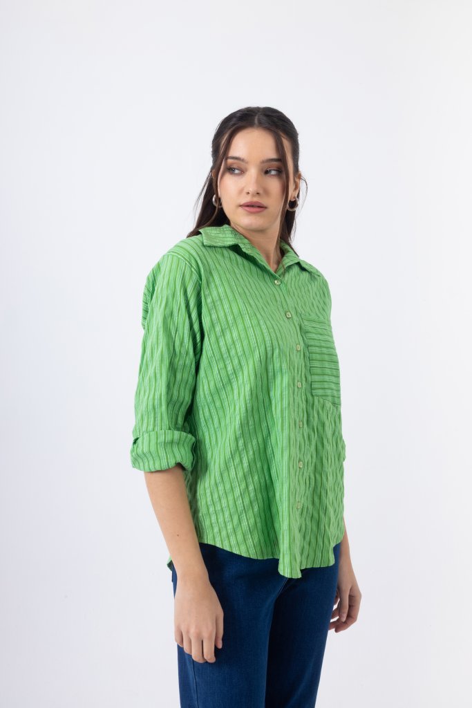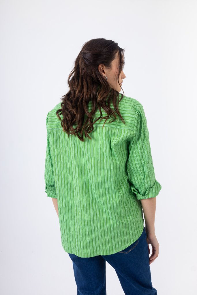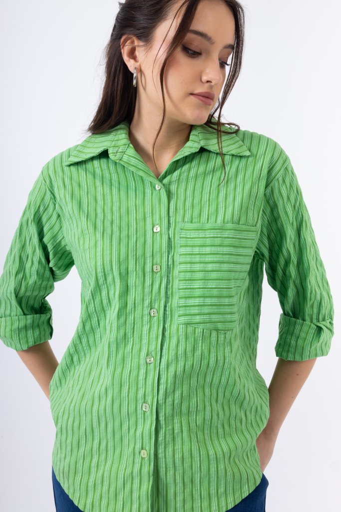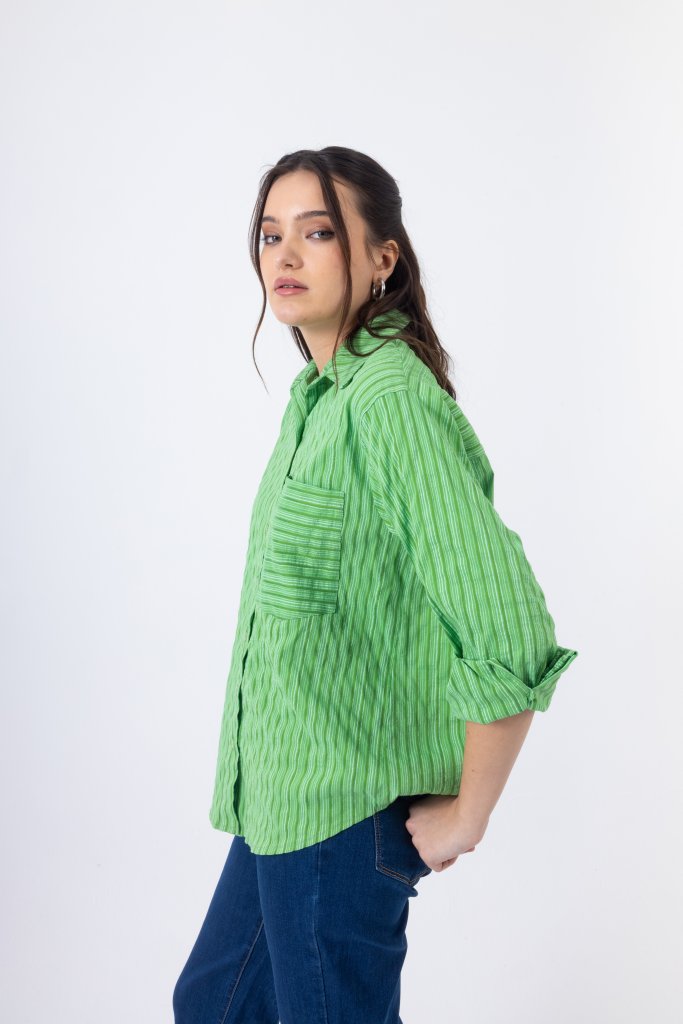 Κομψό πουκάμισο με λεπτές ρίγες σε αποχρώσεις του έντονου πράσινου που δημιουργούν ένα φωτεινό και ιδιαίτερο αποτέλεσμα. Διαθέτει κλασικό γιακά και κλείσιμο με κουμπιά στο μπροστινό μέρος, ενώ η διακριτική τσέπη στο στήθος προσθέτει μια μοντέρνα πινελιά στο σχέδιο. Η άνετη γραμμή του χαρίζει κομψότητα και άνεση, καθιστώντας το ιδανικό για καθημερινές αλλά και πιο προσεγμένες εμφανίσεις.