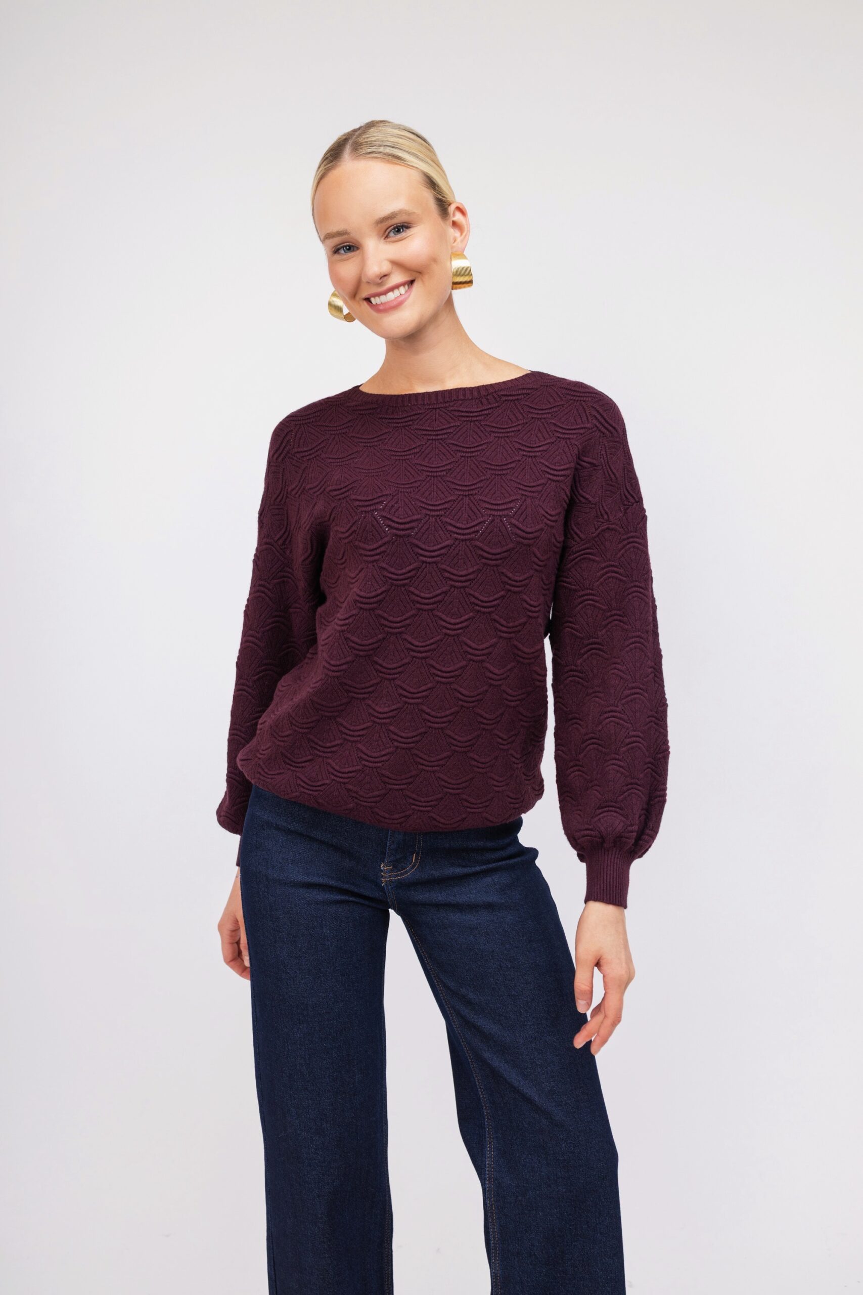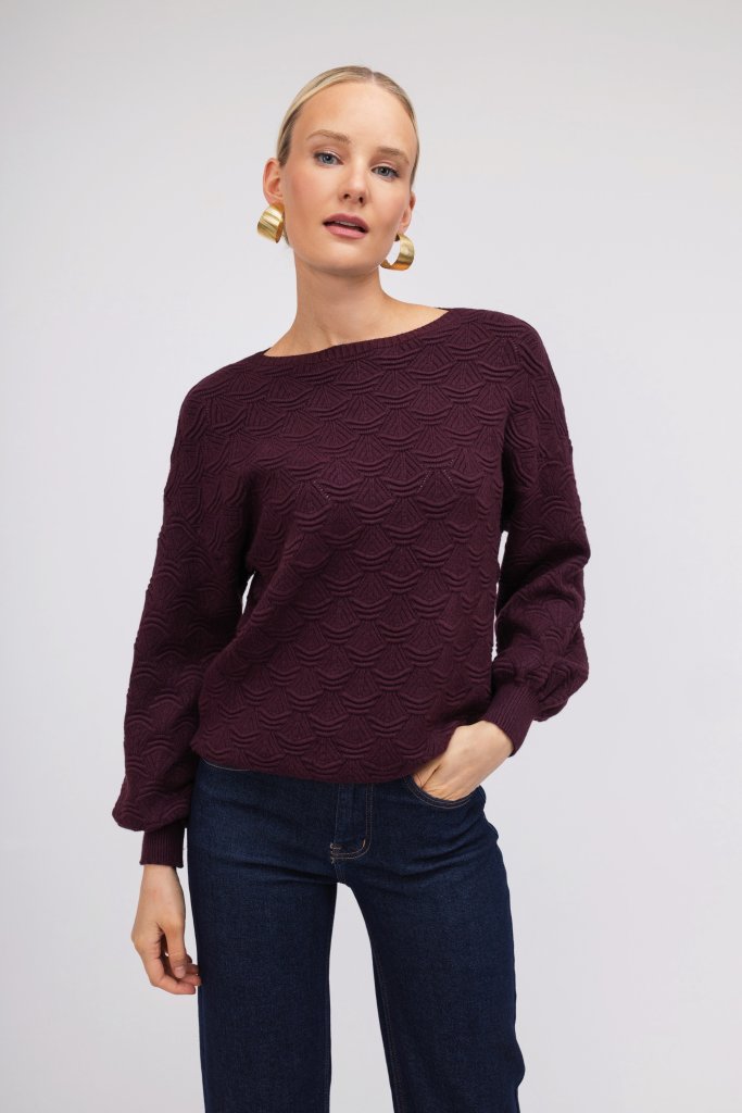 Γυναικείο μπορντώ/μαύρο/λευκό πουλόβερ με ανάγλυφο σχέδιο. Διαθέτει λάστιχο στο τελειώμα των μανικιών και κλειστή λαιμόκοψη. Ένα μονόχρωμο και ζεστό σχέδιο που θα λατρέψετε για τις κρύες ημέρες του χειμώνα.