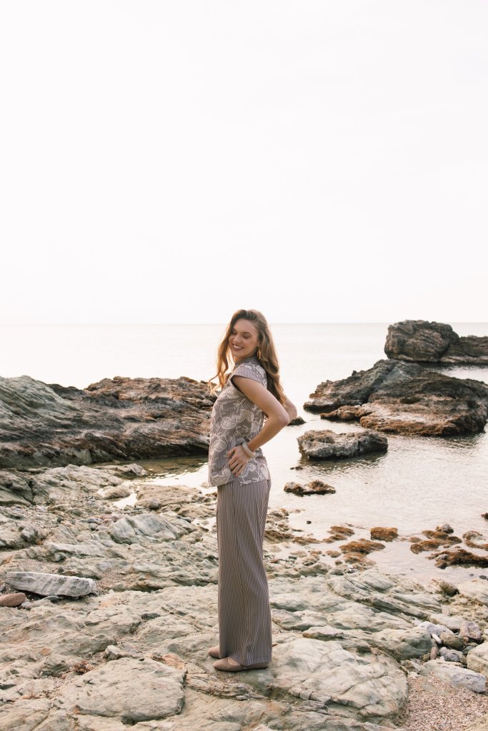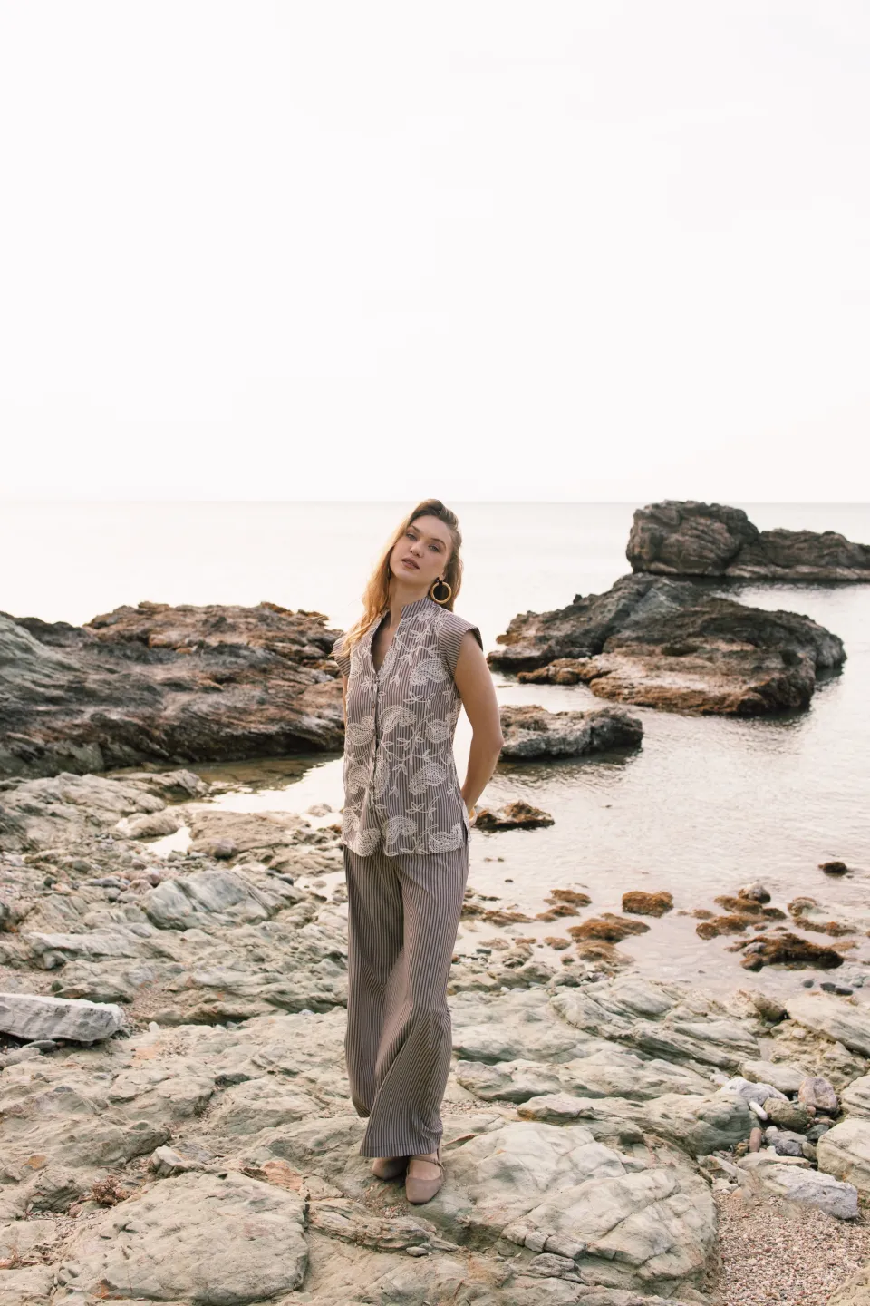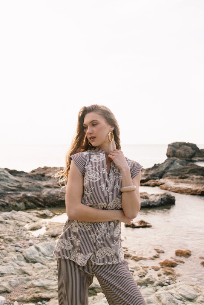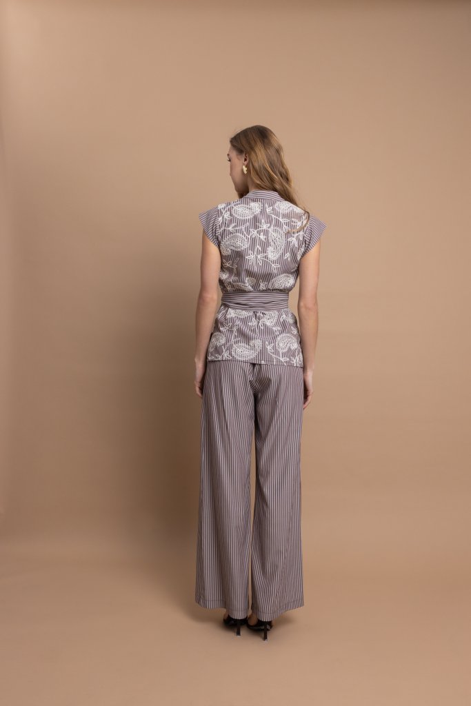 Κομψό και ιδιαίτερο γυναικείο σετ σε γήινες taupe αποχρώσεις, που συνδυάζει τη διαχρονική ρίγα με ρομαντικές κεντητές λεπτομέρειες. Το σετ αποτελείται από αμάνικη μπλούζα με διακριτικό βολάν στους ώμους, κουμπάκια στο μπροστινό μέρος και αποσπώμενη ζώνη που δένει στη μέση, αναδεικνύοντας τη σιλουέτα με θηλυκό και elegant τρόπο.
