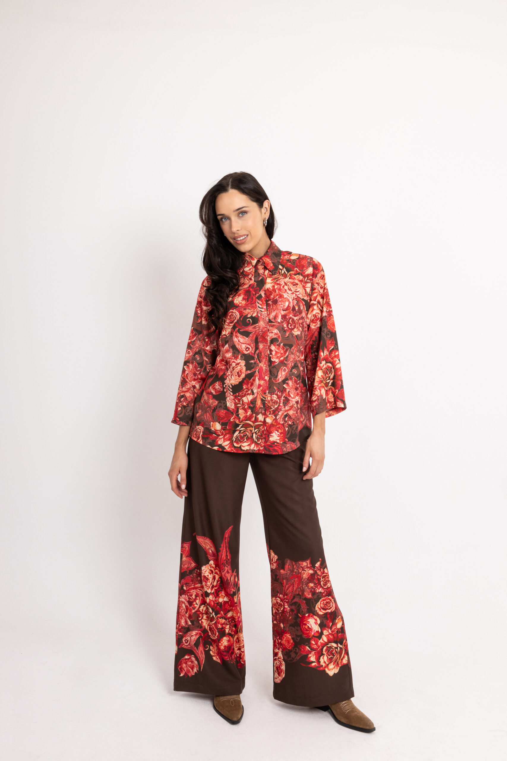 OPEN Σετ Μπλούζα-Πουκαμίσα με Παντελόνι | Floral Καφέ