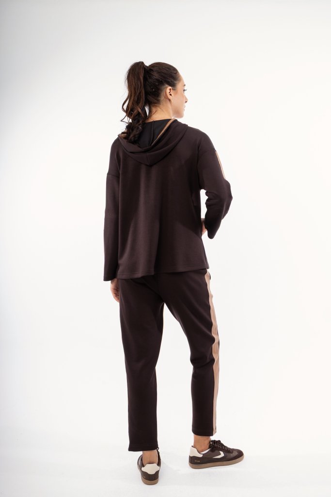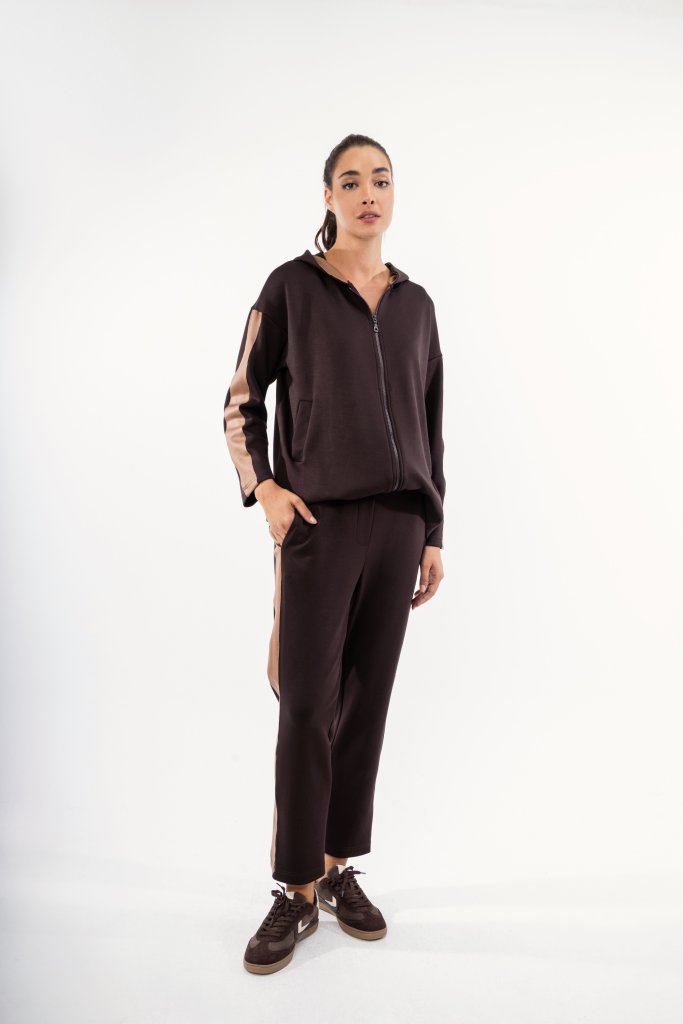 Γυναικείο καφέ παντελόνι από απαλό ύφασμα τύπου φούτερ. Με μπρονζέ λεπτομέρειες στο πλάι. Ένα σχέδιο ιδανικό για ένα καθημερινό casual look. Συνδυάστε το με την αστίχτοιχη ζακέτα και αναβαθμίστε το στιλ σας.