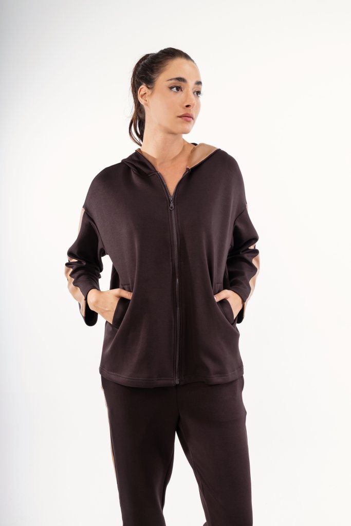 Γυναικεία ζακέτα- φούτερ με φερμουάρ και κουκούλα. Διαθέτει μπρονζέ λεπτομέρεια στα πλαινά μέρη. Ένα σχέδιο ιδανικό για τη καθημερινότητά σας αλλά και για όλες σας τις αθλητικές δραστηρίοτητες. Συνδυάστε το με το αντίστοιχο παντελόνι και δημιουργήστε ένα τέλειο athleisure look.