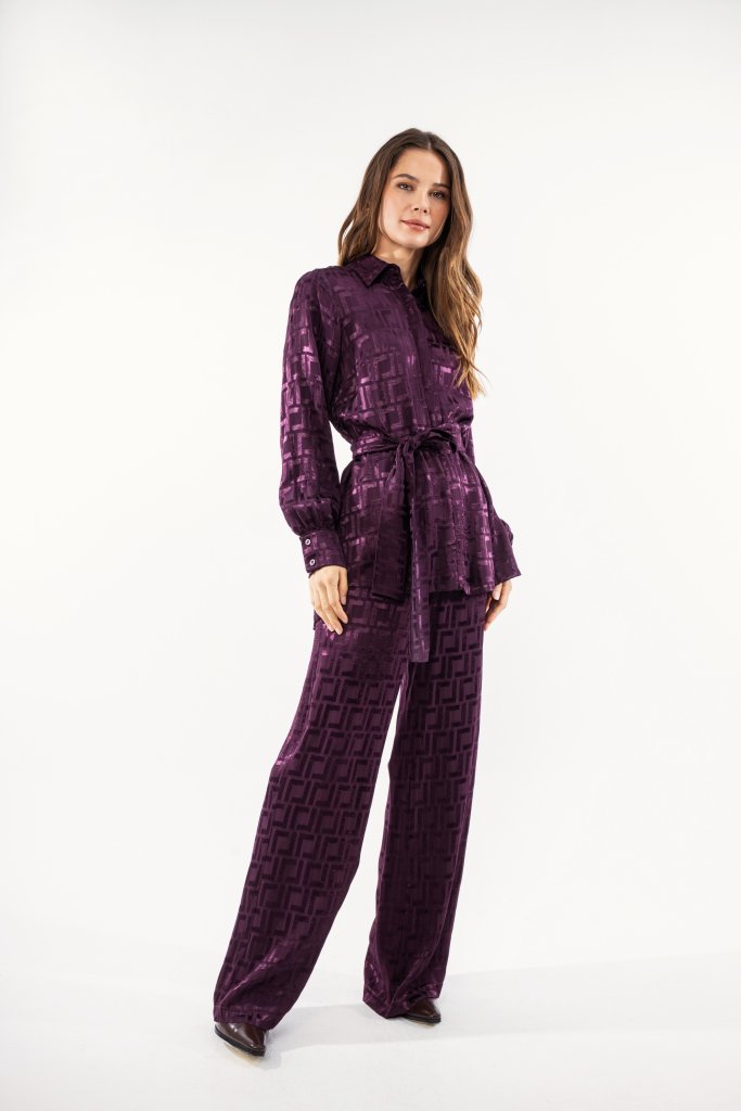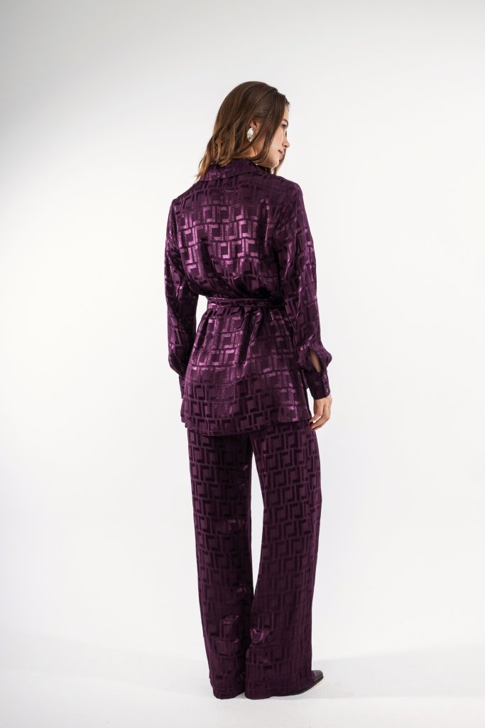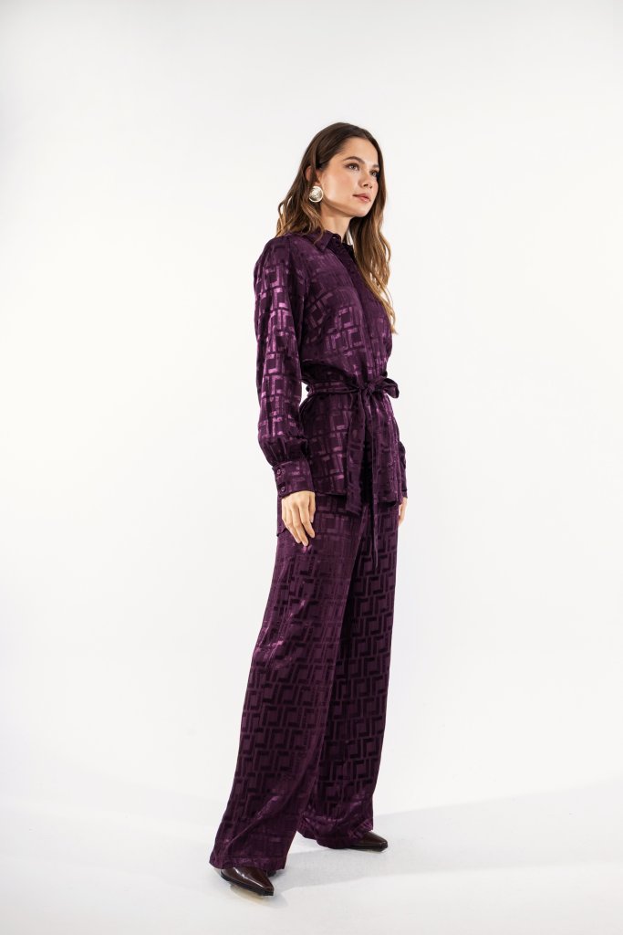 Σετ με πουκάμισο και παντελόνα σε σκούρο μώβ χρώμα. Κλείνει με κουμπί και φερμουάρ. Διαθέτει διακριτικά βελουτέ γεωμετρικά σχέδια σε όλο το μήκος του. Αναβαθμίστε τη χειμερινή σας συλλογή με αυτή τη κομψή δημιουργία και χαρίστε στον εαυτό σας στιλ και άνεση.