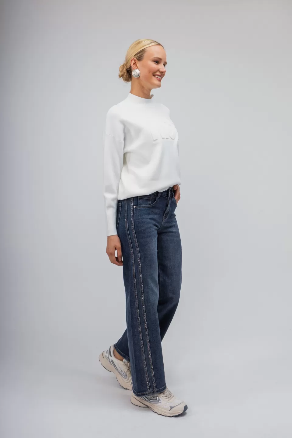 Τζιν παντελόνι με glitter στο πλάι για να σας χαρίσει λάμψη και στην πιο απλή casual εμφάνιση. Κλείσιμο με φερμουάρ και κουμπί. Διαθέτει εξωτερικές τσέπες.