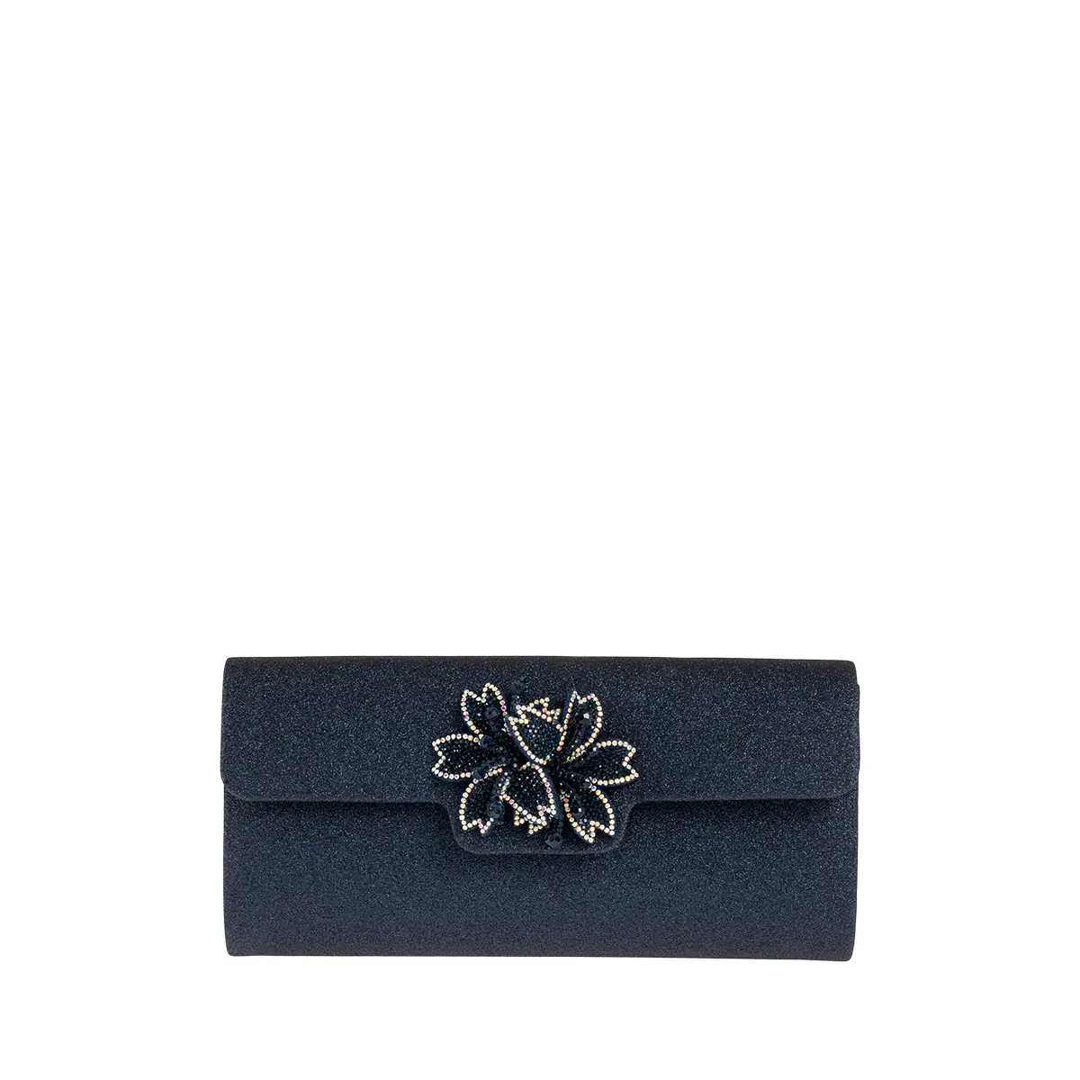 Γυναικείο αμπιγιέ τσαντάκι φάκελος από ύφασμα με glitter και λουλούδι με στρας. Κλείνει με μεταλλικό μαγνητικό κούμπωμα και στο εσωτερικό της υπάρχει πλαϊνό βοηθητικό τσεπάκι. Περιέχει αλυσιδάκι για χιαστί εφαρμογή ή εφαρμογή στον ώμο.